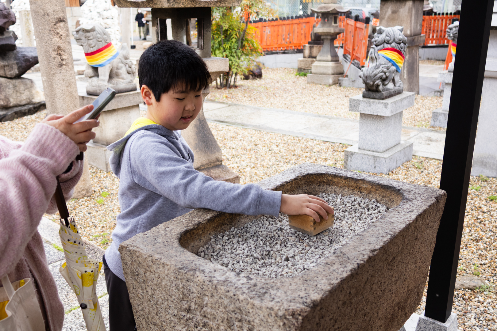 他にも帆立の貝殻に目標や願い事を書き、それを実現させるために断たなければいけないことを赤い玉(断ち玉)に念じ、はじまりの碑に空いた穴に投げて通して願う祈祷や、良い風を入れたい物(仕事道具や財布、手作りのお守など)を台に起き、献風台の風車に団扇で風を送ることで良い風を入れる「風送り」(当店の新オラクルカードに良い風を入れてきました)、船に見立てた枡にお金を入れ海に見立てた手水石を渡す動作をすることで金運や商売繁盛を願う「流し枡」など変わった参拝方法がある神社です。