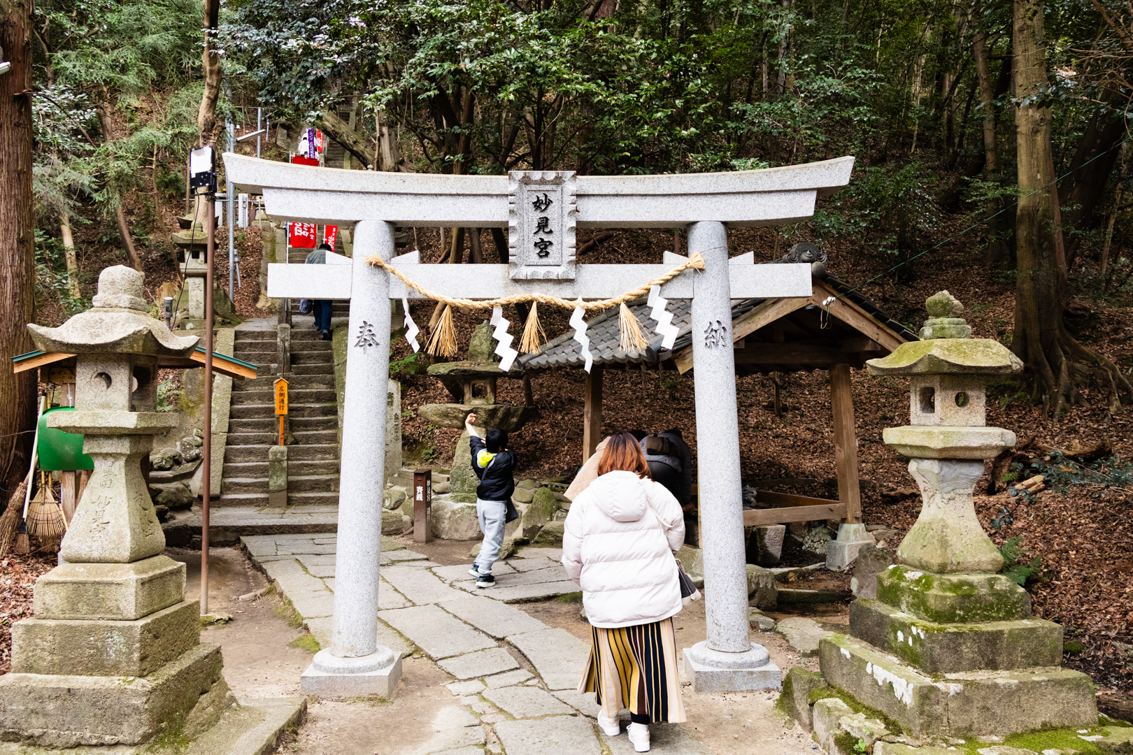 鳥居をくぐると急勾配の階段を登っていくと拝殿と社務所、御神体である織女石があります。