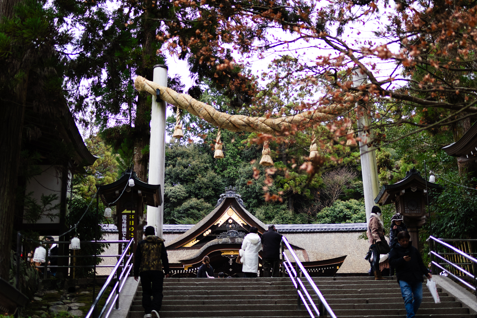 参道には車が通れる鳥居としては日本最大(高さ32.2m、柱間23m)の鳥居があります。