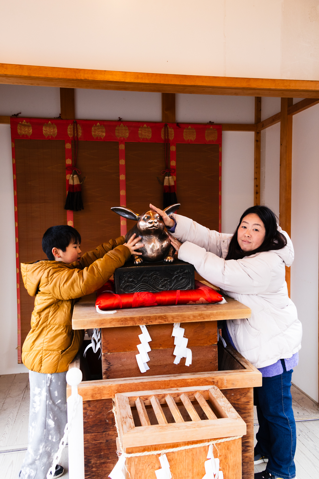 参集殿の玄関(正月は祈祷殿前)には「なでうさぎ」がりあり、撫でると身体の痛いところを治してくれたり、願い事を叶えてくれそうです。